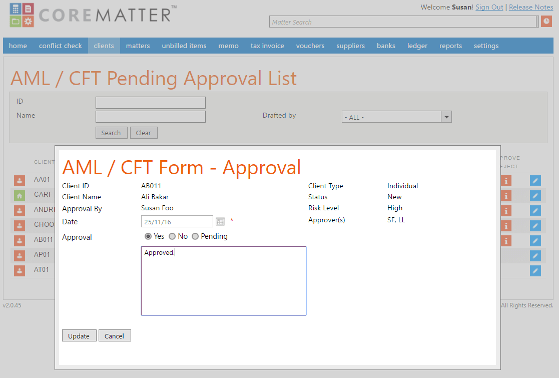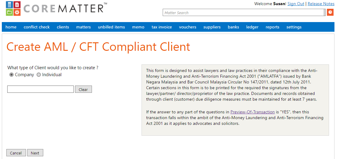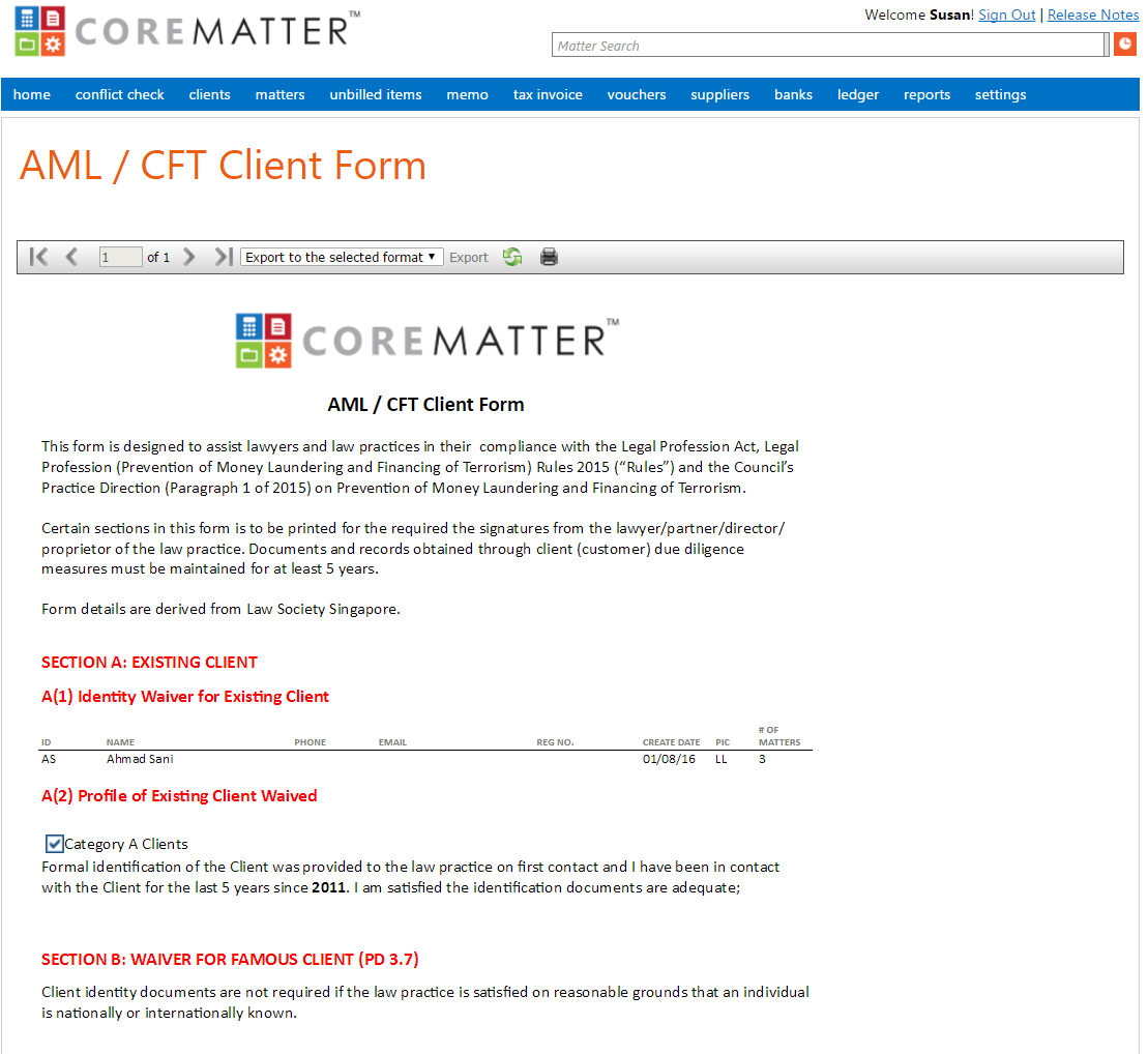 It is with this that we are happy to announce the new AML/CFT Client Creation module, developed on the request of our clients in Singapore and Malaysia. Depending on which country the firm is from, the AML/CFT form capture will be based on the guidelines given by the country, in particular, Law Society of Singapore and Bank Negara Malaysia respectively. After keying in the data in the CoreMatter AML/CFT module, based on a series of questions posed, a printout and an email trigger to the appropriate partner for approval.
